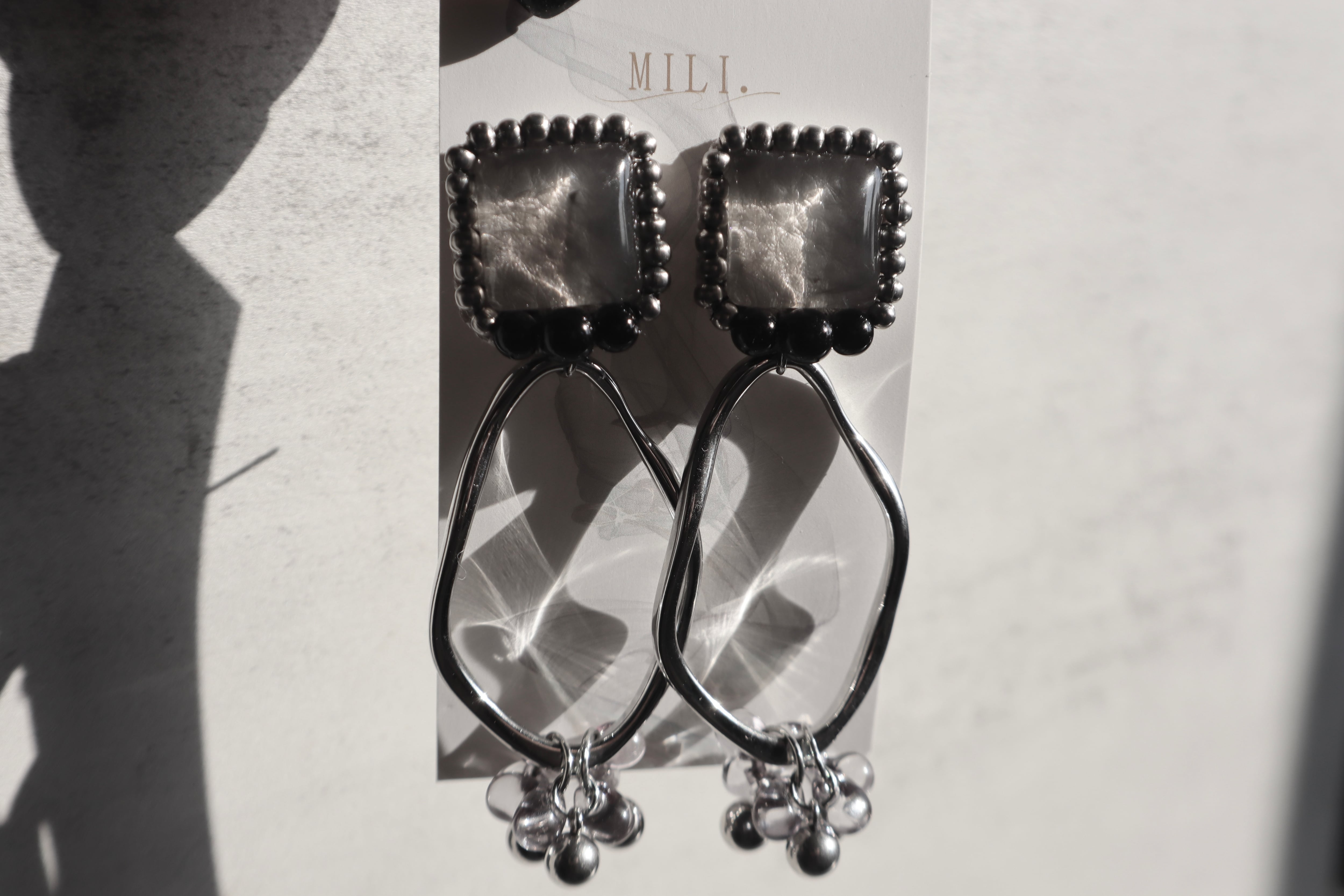 透明ベースにブラックマーブルのパーツと、大きなメタルフープが印象的な大ぶりピアスです♥