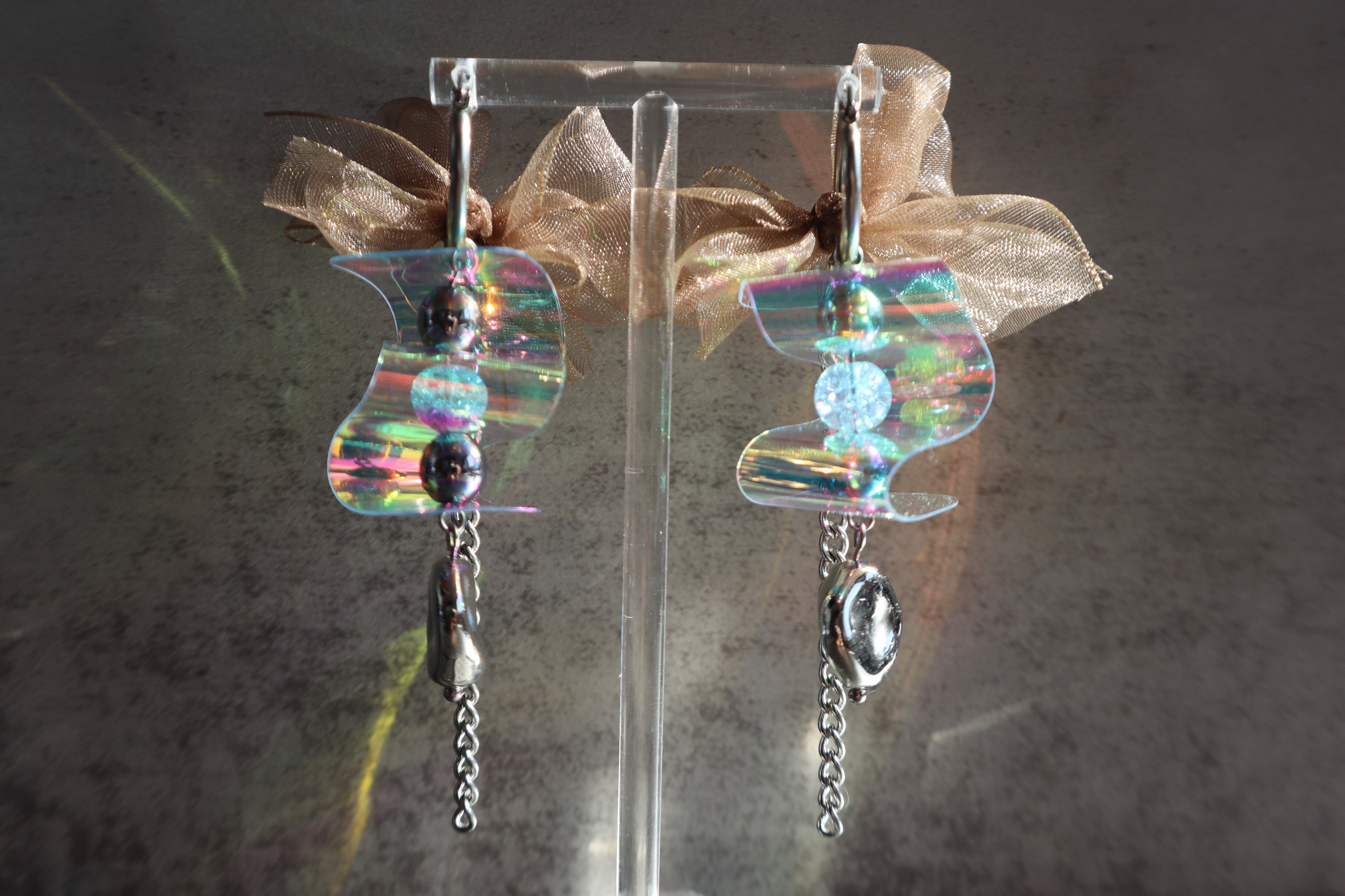 オーロラのように光を反射し、動くたびに表情を変える存在感のあるピアス。
